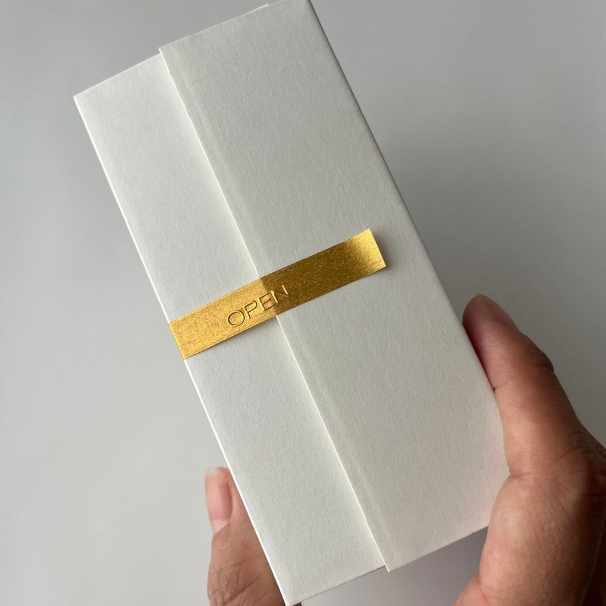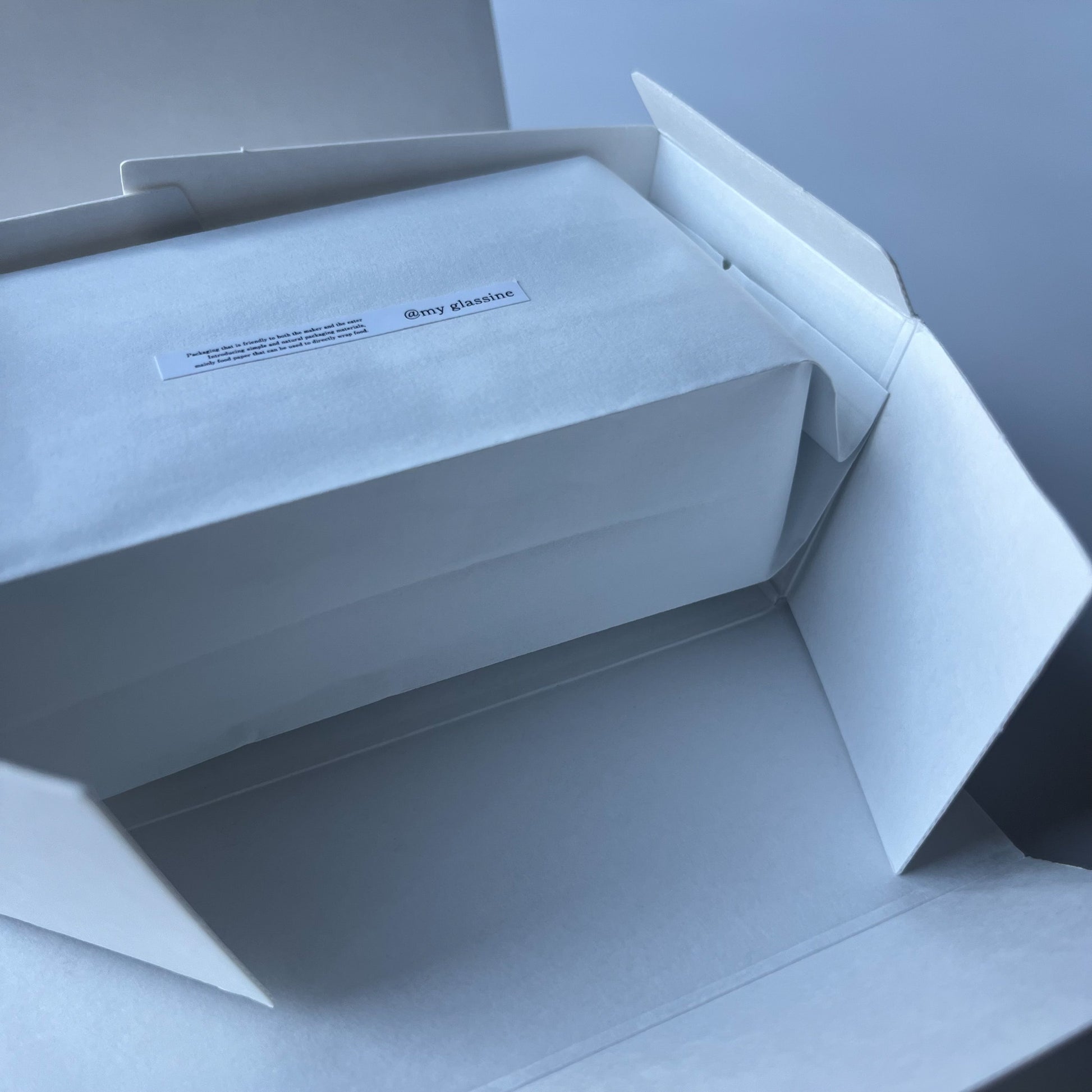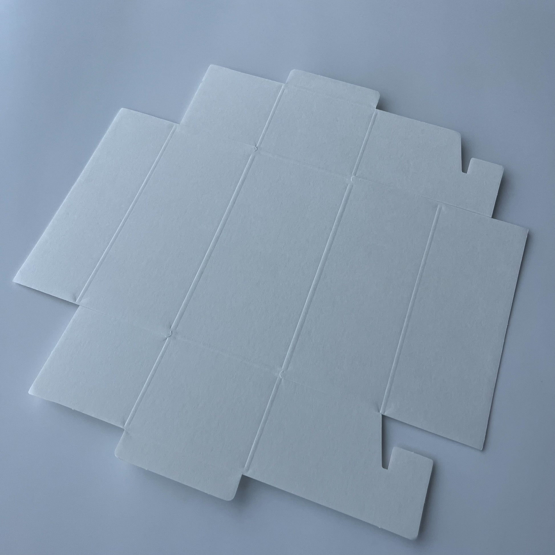 組み立て前は平らな状態ですのでストック場所も取りません。あえてフラップを留めるフックや差し込みを付けていません。ラッピングのアクセントとして、飾りゴムや紐で留めていただくと、モダンな雰囲気に仕上がります。