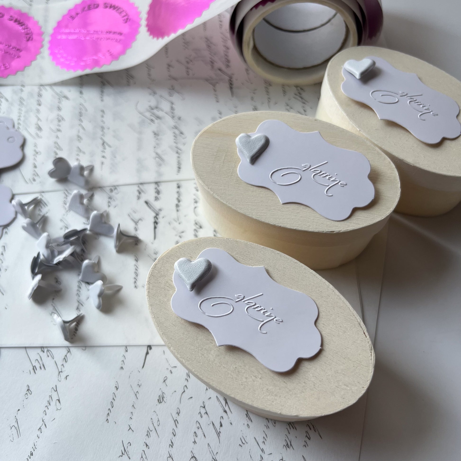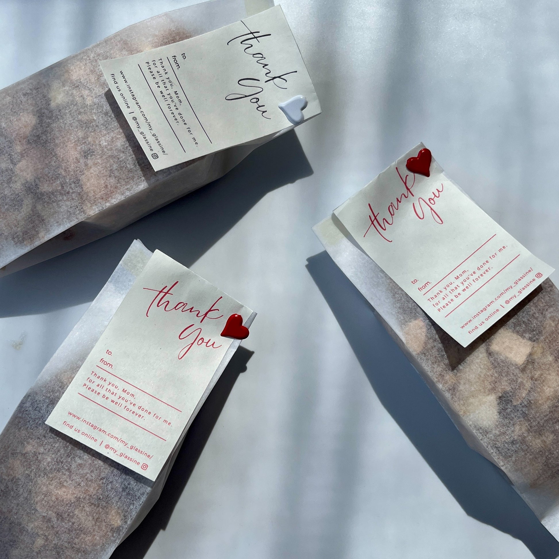 お持ちのショップカード、お菓子の情報、メッセージカード、リボンなど素材を選ばす留めることができます。